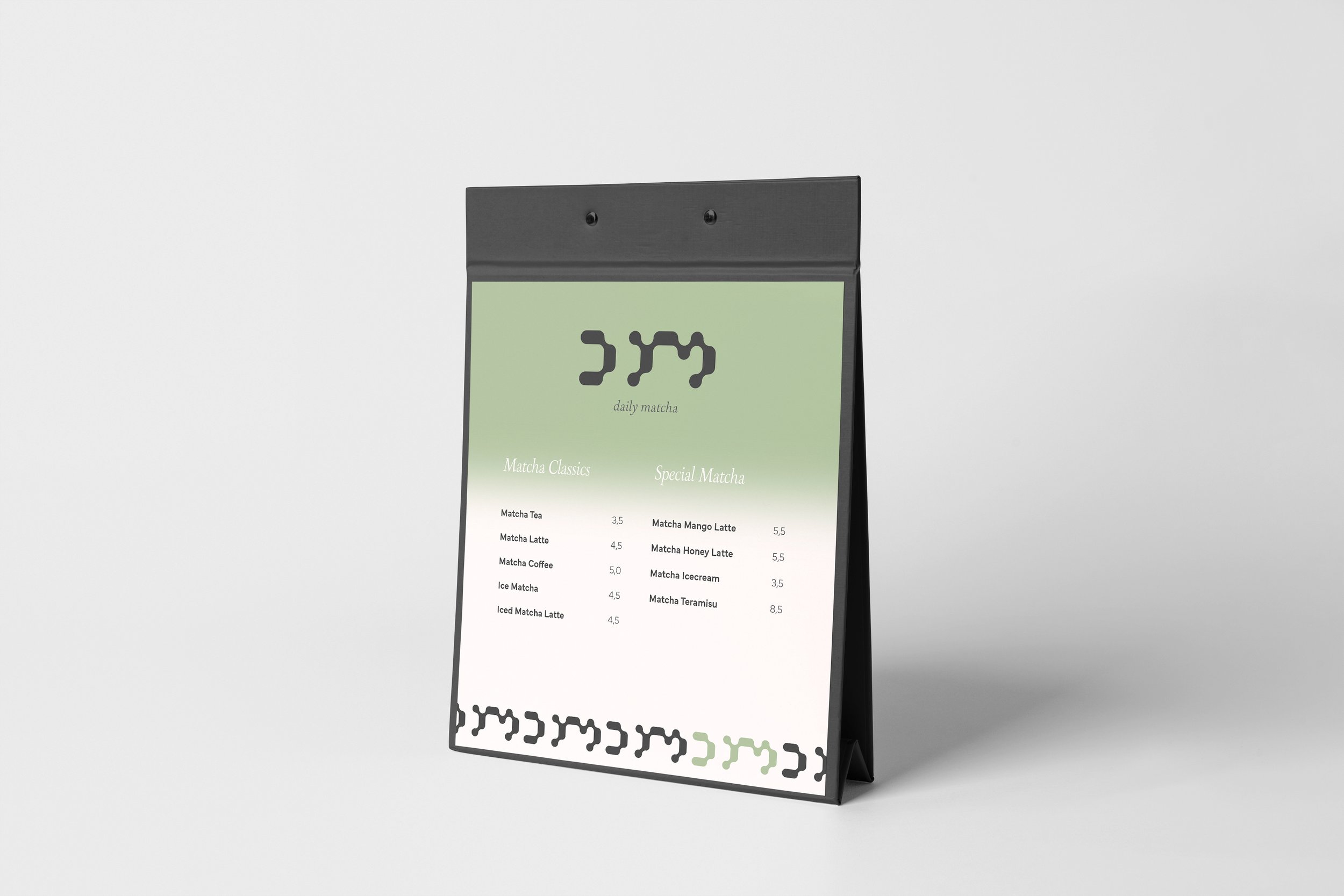 Als Erweiterung der Markenidentität wurde das Menü konzipiert und übernimmt zentrale Elemente des Logos in reduzierter Form. Der sanfte Grünverlauf schafft eine natürliche, ruhige Wirkung und stellt eine direkte Verbindung zum Produkt Matcha her, während die klare Typografie für gute Lesbarkeit und einen modernen, hochwertigen Eindruck sorgt.