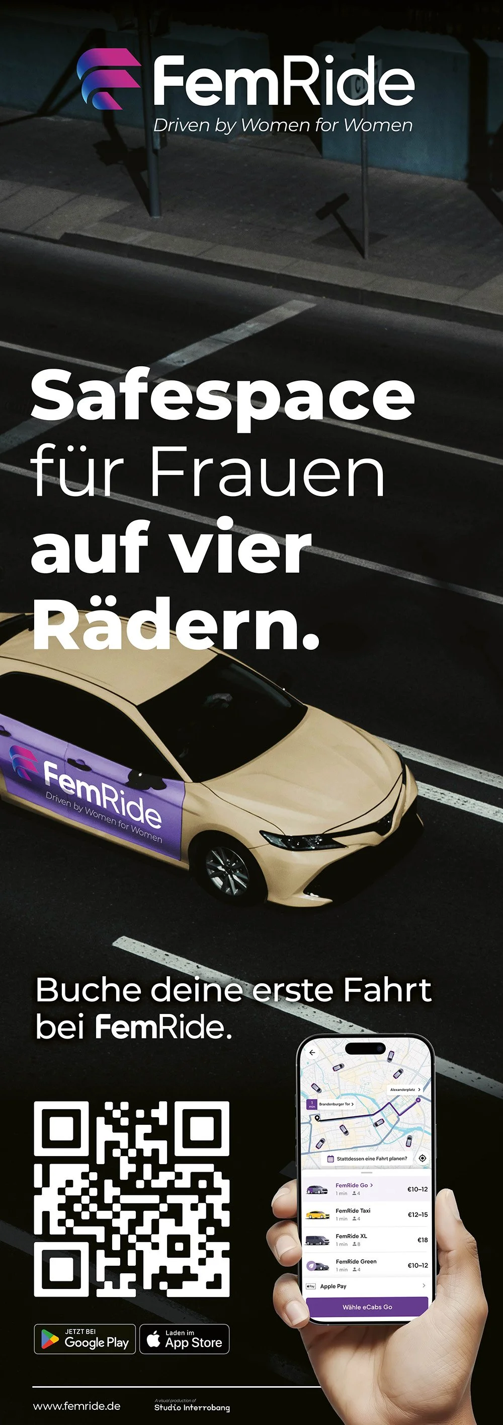 Die Seite in Richtung der Straße, zeigt die Nutzungssituation aus der Außenperspektive: Ein mit FemRide gebrandetes Fahrzeug dient als zentrales Wiedererkennungselement und macht die Fahrzeuge im Stadtbild unmittelbar identifizierbar. Ergänzend wird die Benutzeroberfläche der App dargestellt, um einen schnellen, intuitiven Eindruck von Funktionsweise und Ablauf zu vermitteln.