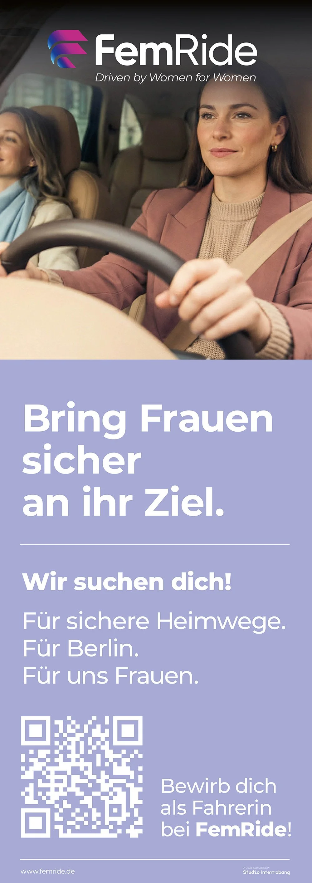 Die zweite, zur Passantenfrequenz ausgerichtete Plakatseite richtet sich gezielt an potenzielle Fahrerinnen von FemRide. Sie fungiert als Aufruf an Frauen, die aktiv dazu beitragen möchten, andere Frauen sicher durch die Stadt zu begleiten und ihnen verlässliche Mobilität zu ermöglichen.