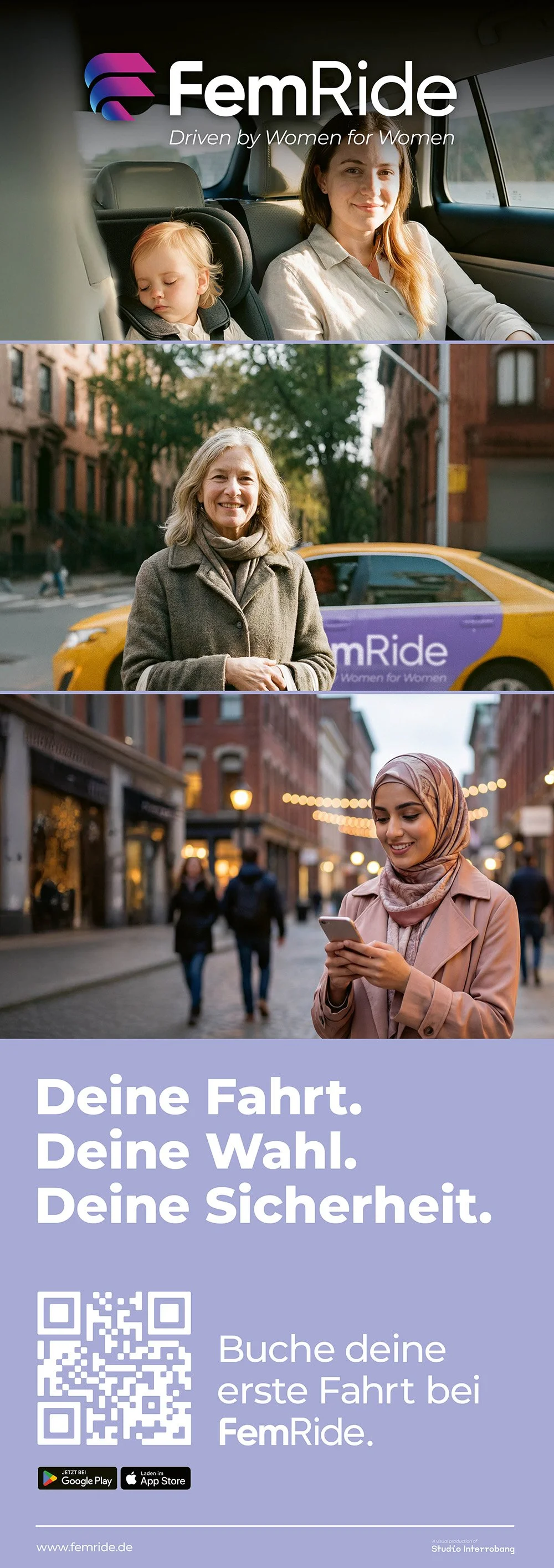 Eine Plakatseite, ausgerichtet zur Passantenfrequenz, visualisiert drei typische Alltagssituationen, in denen Frauen den Service von FemRide nutzen würden. Gezeigt werden unter anderem eine Mutter mit Kind, die komfortabel und stressfrei durch die Stadt gelangen möchte, eine ältere Frau mit schwerem Einkauf sowie Frauen aus neu zugewanderten Lebenssituationen.
