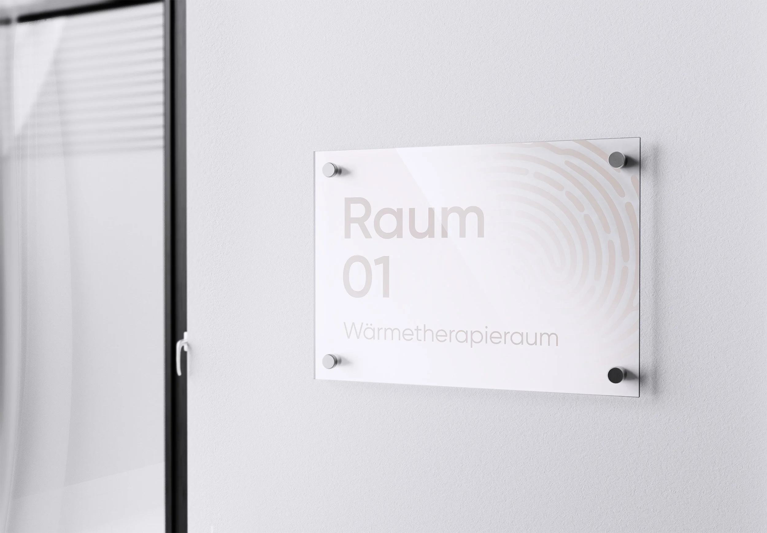 Die Schilder der Behandlungsräume wurden bewusst ruhig gestaltet, um die therapeutische Atmosphäre zu unterstützen.