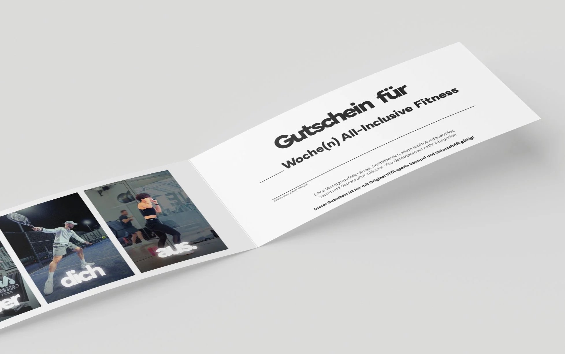 Durch die Kombination einer minimalistischen, schwarzen Außenseite, die Wertigkeit signalisiert, und einer dynamischen Innenseite, die das "Power. dich aus."-Motto des Vita Sports Clubs visualisiert, wird das Werbemittel zu einem hochwertigen Touchpoint. Die Gestaltung legt Wert auf eine klare Typografie, eine ausbalancierte Komposition und konsistente visuelle Sprache, die die Markenbotschaft effektiv kommuniziert.