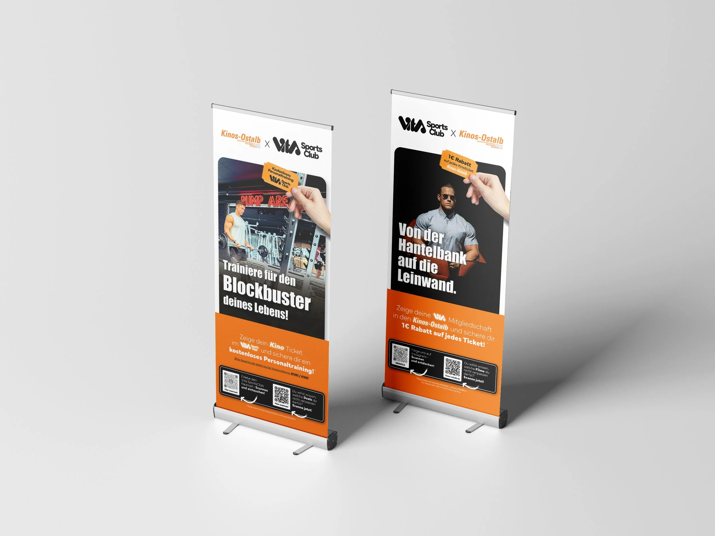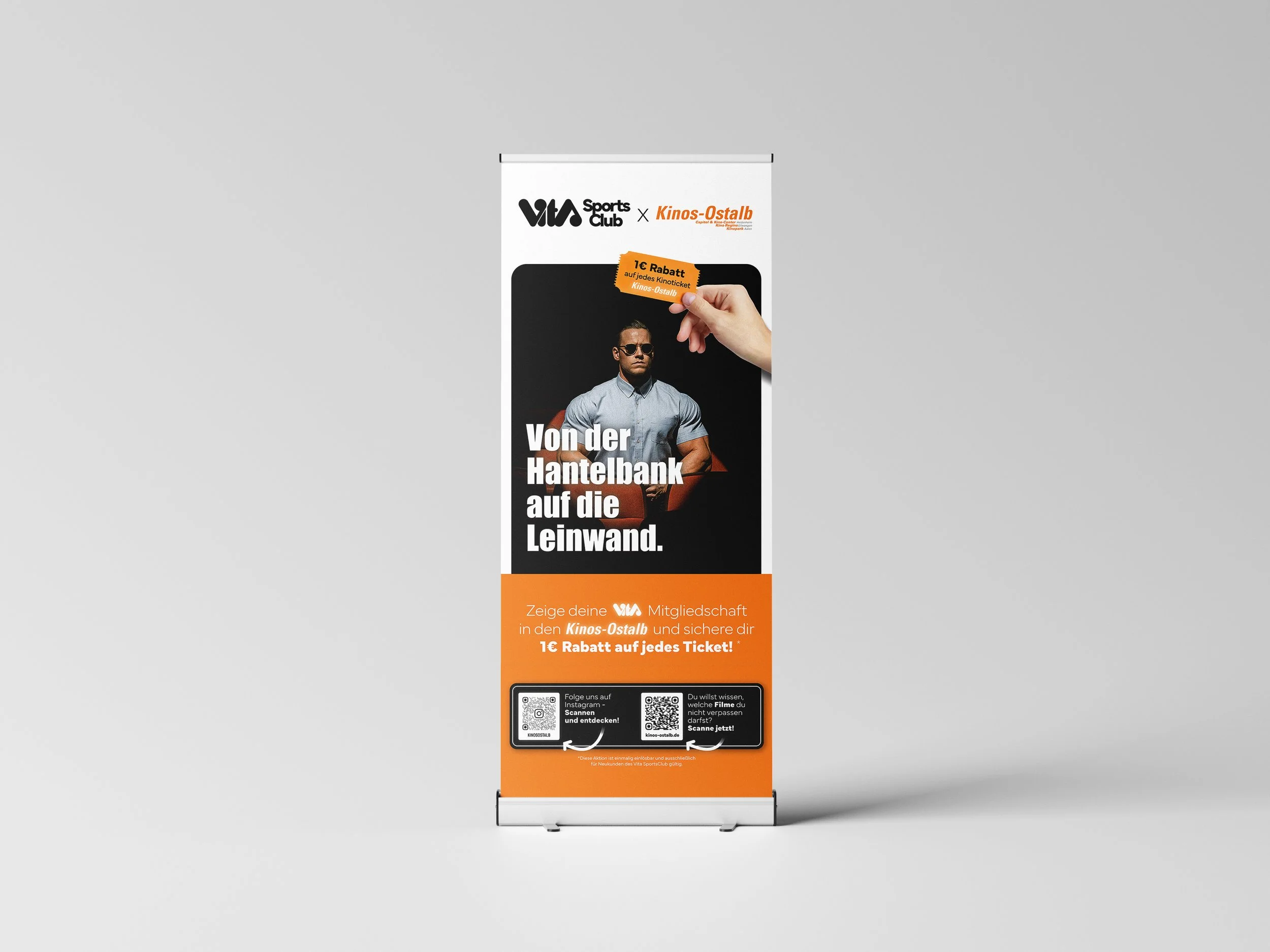 Dieses Roll-up-Display für die Partnerschaft mit dem Kino beweist, wie wichtig kreatives Design für erfolgreiche Kooperationen ist. Die clevere Headline "Von der Hantelbank auf die Leinwand" verbindet die beiden Marken direkt und einprägsam.