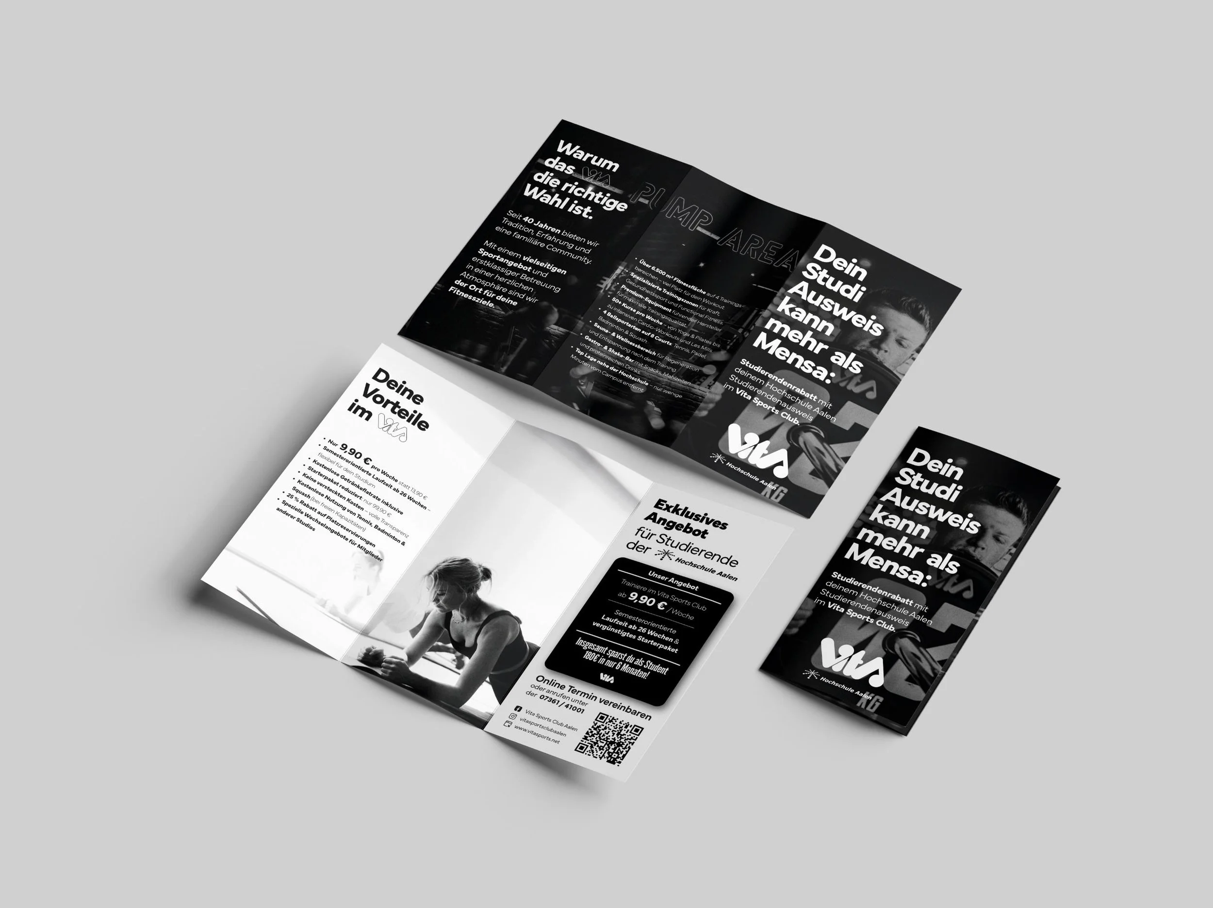 Dieser Flyer für den Vita Sports Club spricht gezielt Studierende der Hochschule Aalen an. Eine moderne, dynamische Gestaltung ersetzt lange Texte und präsentiert die Vorteile klar und motivierend.