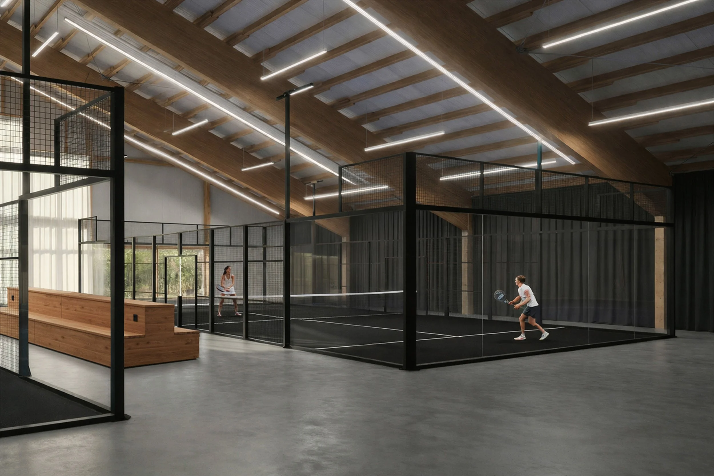 Diese Visualisierung einer geplanten Padelhalle in einer ehemaligen Tennishalle zeigt, wie wirkungsvoll die Verbindung aus Innenarchitektur und KI-gestützter Darstellung für die Projektkommunikation sein kann. Das räumliche Konzept übersetzt die bestehende Architektur in eine moderne, sportlich-dynamische Umgebung und macht die zukünftige Nutzung bereits in der Planungsphase erlebbar. Durch die Kombination aus klarer Gestaltung, atmosphärischer Lichtstimmung und realistischer Darstellung entsteht aus einer Idee ein überzeugendes Bild, das Investoren, Betreiber und Nutzer gleichermaßen anspricht.